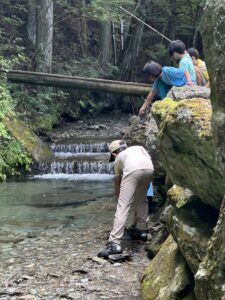 お魚釣りもお手の物。竿をつくって、どんどん吊り上げます。